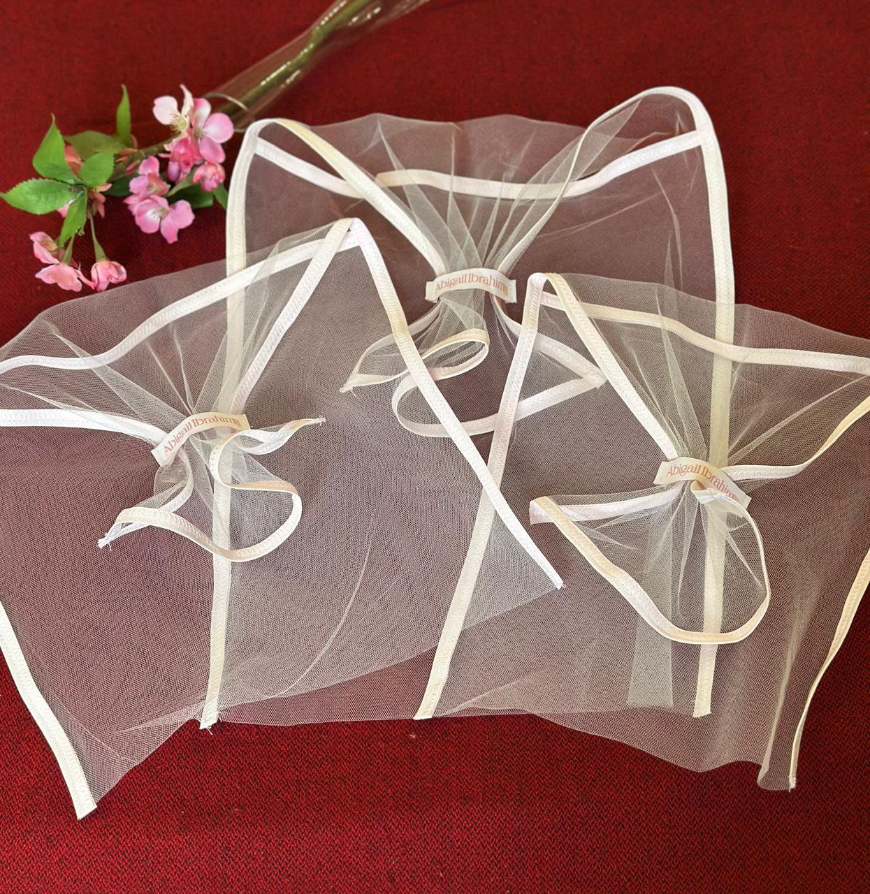 Kit de saquinhos multifuncionais, feitos artesanalmente em tule francês branco com acabamento em viés de algodão na cor salmão. O design das peças é delicado e elegante. O kit é composto de 3 unidades em tamanhos P, M e G para permitir o uso com roupas e acessórios de diferentes tamanos e formas.