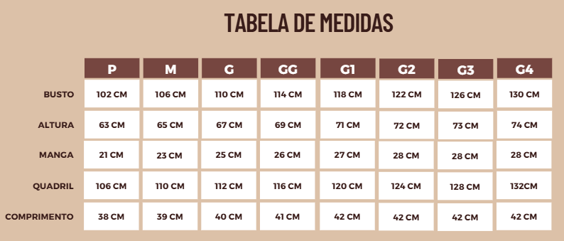 Nossa modelagem é fiel ao padrão de medidas do mercado. Para maior segurança, recomendamos consultar a tabela de medidas na página do produto.